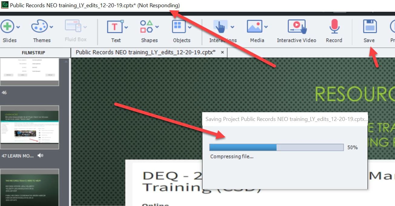 I have made some changes to a project in captivate and when I try to save the changes I click SAVE but the slide only stops at 50% and will not finish saving. I need to update a training in iLearn. What is preventing the project from saving? I even shut down the computer and started it again last night and this morning. The screen will sit there like this (see below) for about 5 minutes and then just disappear without fully saving the changes.