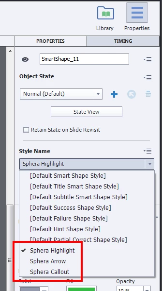 In Captivate 9, I've saved some shape and caption styles that are available when I'm adding shapes/captions to my various slides: