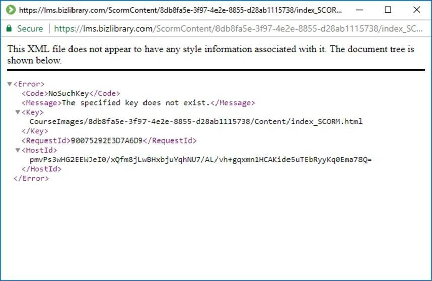 <Message>The specified key does not exist.</Message> <Key> CourseImages/8db8fa5e-3f97-4e2e-8855-d28ab1115738/Content/index_SCORM.html
