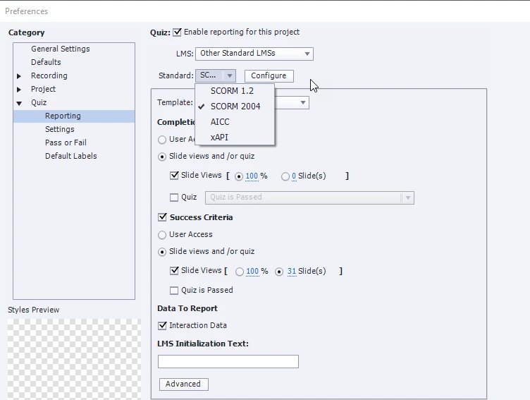 Hello, I have created a SCORM file with these settings: