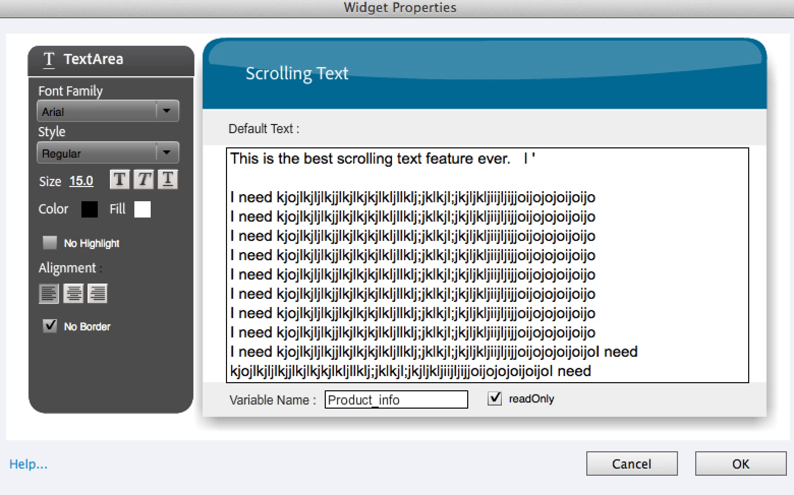 Can you please direct me to a widget of libraries that can provide me with this functional of textbox with a scrollable text. Allowing you also to format text and appear transparent and works to publish in HTML5?