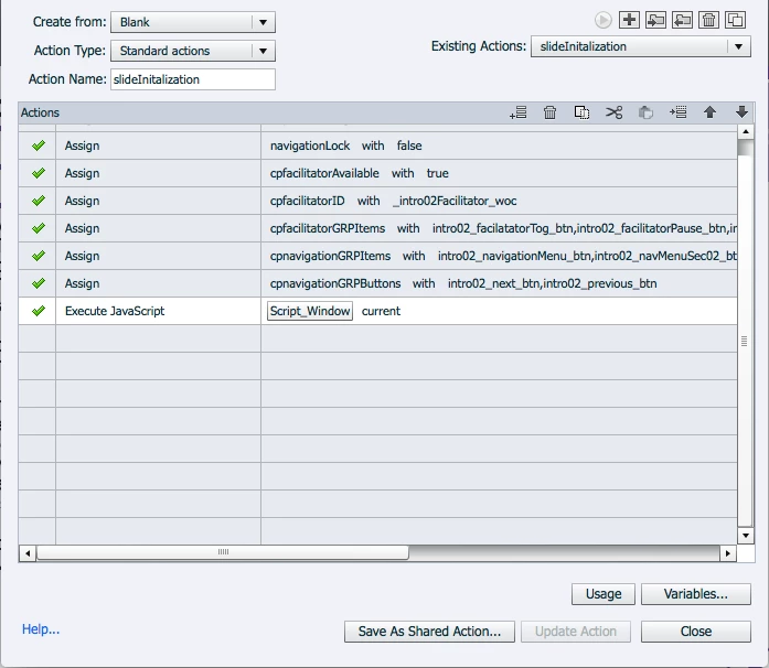 I have an advanced action that assigns a number of values to variables created in Captivate. As shown in the figure below.