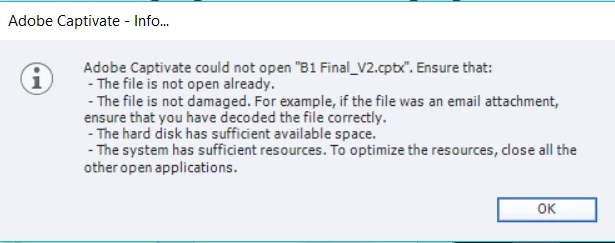 One of my team members recently shared a cptl file. I downloaded it and its saved in my received files. But as I try to open it, following message shows up:(I have cleared the cache and the disk space is sufficient)