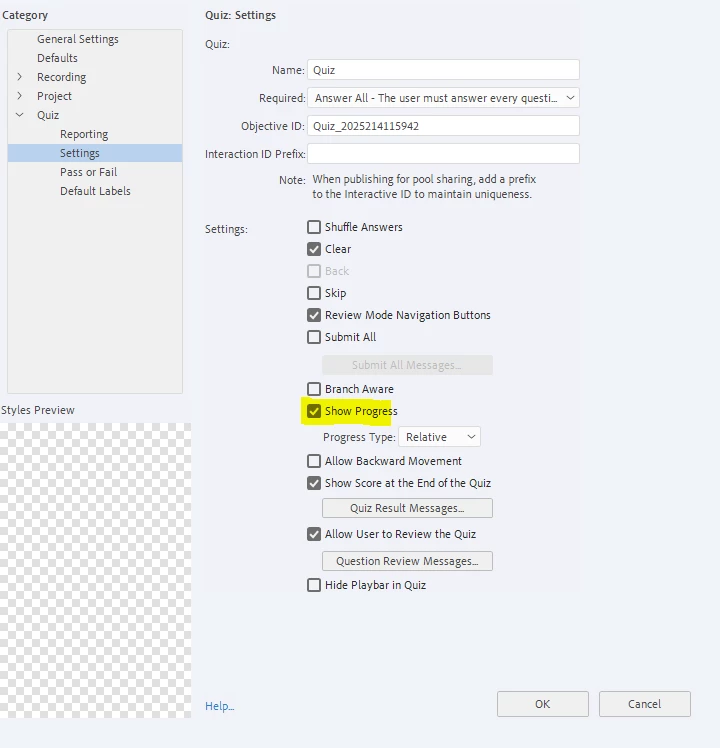 I am working on a quiz within Adobe Captivate. On the file, it clearly shows Quextion X out of 12, which I want the person to see, but then when I preview it Browser, the progress doesn't show.