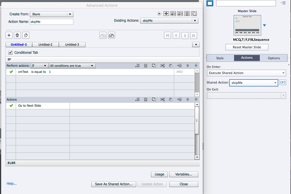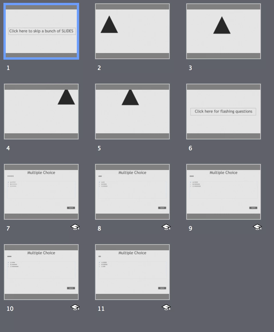 The scripts and navigation still work fine, a user will rapidly progress through the slides until they reach a slide they are supposed to see. What is different it that the users get a quick flash (one frame?) of of each of the knowledge-check slide contents as they are moving rapidly through the slides they are supposed to skip.