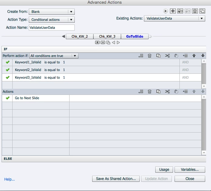 Scenario: I have a slide that has 3 TEB's on it and an Advanced Action triggered by the Submit Button. The Advanced Action checks that the user has entered the correct values in each of the text boxes before advancing. If the user enters the wrong values or leaves any of the TEB's blank, an error message is shown.