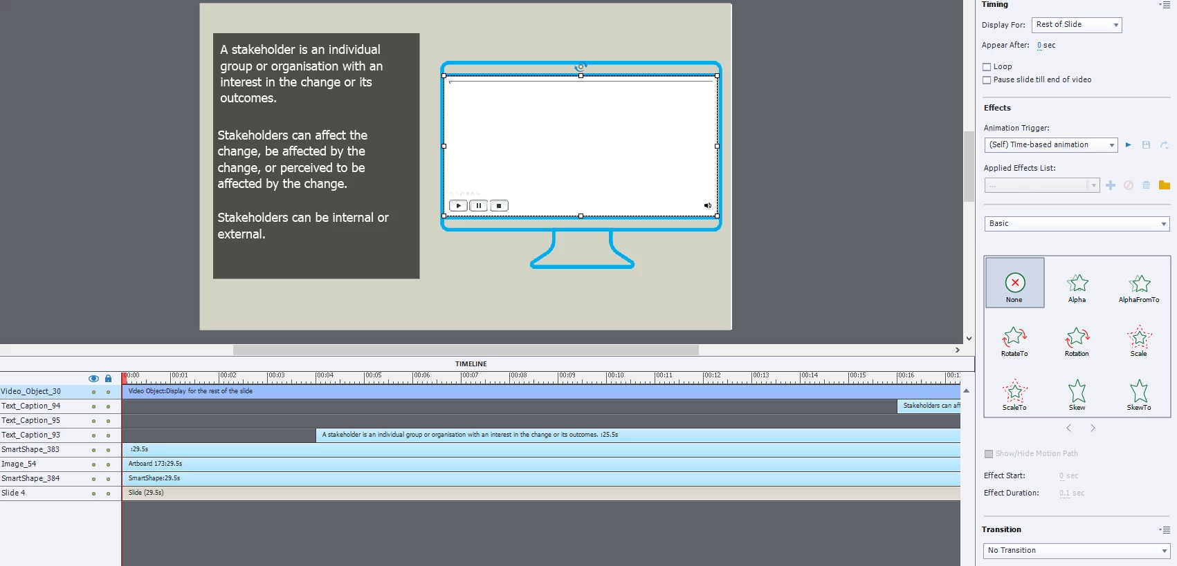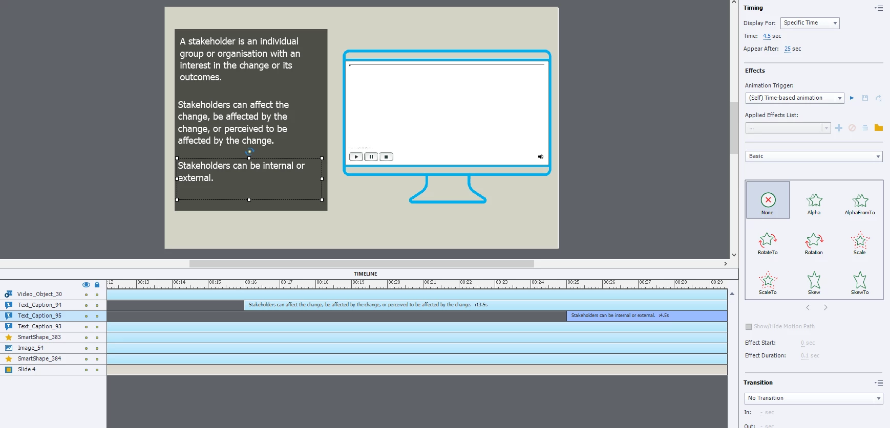 -Is arranged on the timeline to appear in time with the video's audio