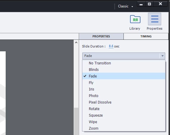 I am using Captivate 2017 (10.0.0.192) and am trying to apply a slide transitions (for the entire slide, not content or objects on the slide).