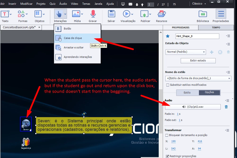 When the student moves the cursor upon the icon, the sound starts, when he moves out, the sound stops. If the student moves upon the icon again, the sound starts from the beginning. Actually when the student moves upon the icon again, the sound starts at the same point it stopped earlier.