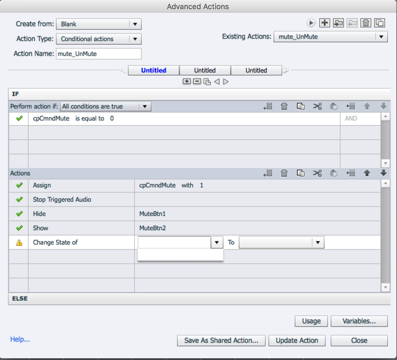 A second issue Im having is that Captivate is not finding any variable names when I put the Change State Of action into the conditional action. Hence why I have to groups (one is called MuteBtn1 and the other MuteBtn2 - these aren't really buttons but simulate the states of the button which is invisible and sitting on top). I dont think this is related though as to me this only seems to be for appearances - not functionality - correct me if I'm wrong).