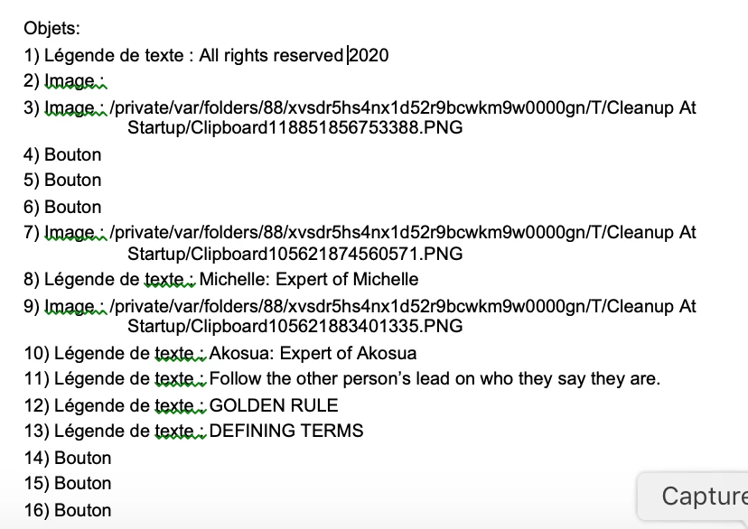 I have changed all of it by going in the Accesibility feature in the Properties tab. I have also changed the name of the images in the library.