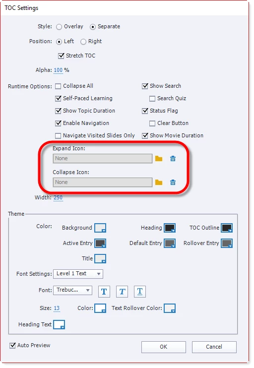 I am using the built in T.O.C in Captivate 8 and successfully set it all up. But Is there a way to change the Open and close button (Chevrons) to one of my own as the chevrons are too small for a learner to see that they are there.