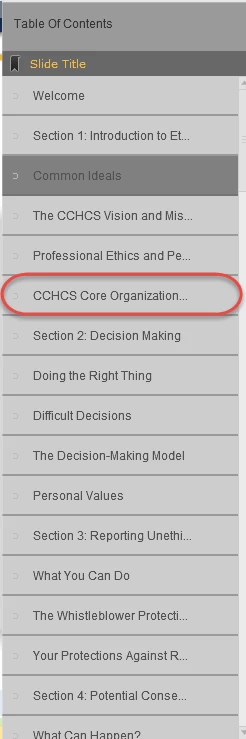 I have a Captivate 9 project where the TOC has been refreshed many times and yet you can't navigate past the slide circled below. Can't click on any titles or move anywhere past this slide. I've compared the settings to other courses where this isn't an issue and can't see anything that would cause this issue. Has anyone else had this problem? If so, how do I fix it?
