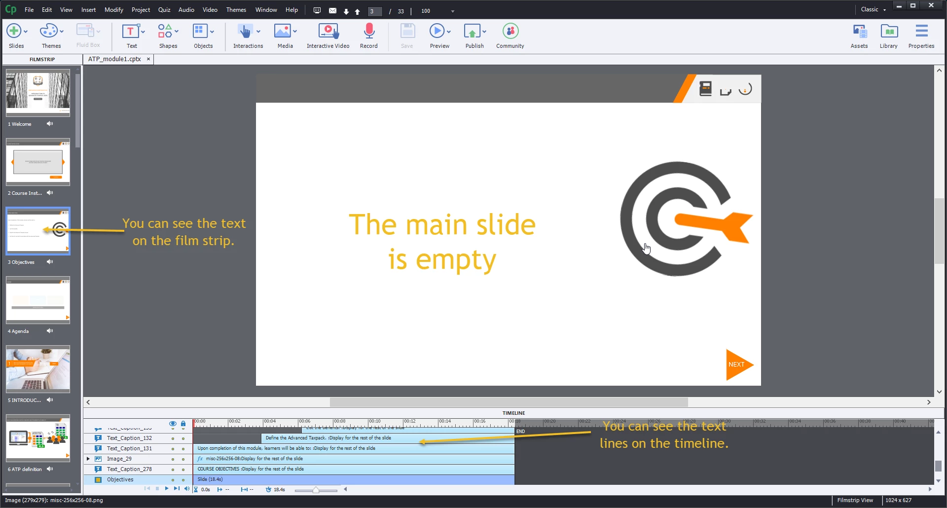 I use Captivate 2019. I've started creating some eLearnig modules (I'm a newbe) but experience a strange behaviour of text captions; I add them to my slides, all is OK, I then save and close the project. When I open it again, all text captions 'disappear'. They don't disappear entirely, just become inactive/invisible on the slide. I have to click on EVERY text instance to 'bring it back to life'. Nothing, but clicking on each text line, seems to work. Can you help me please (screengrab enclosed)?