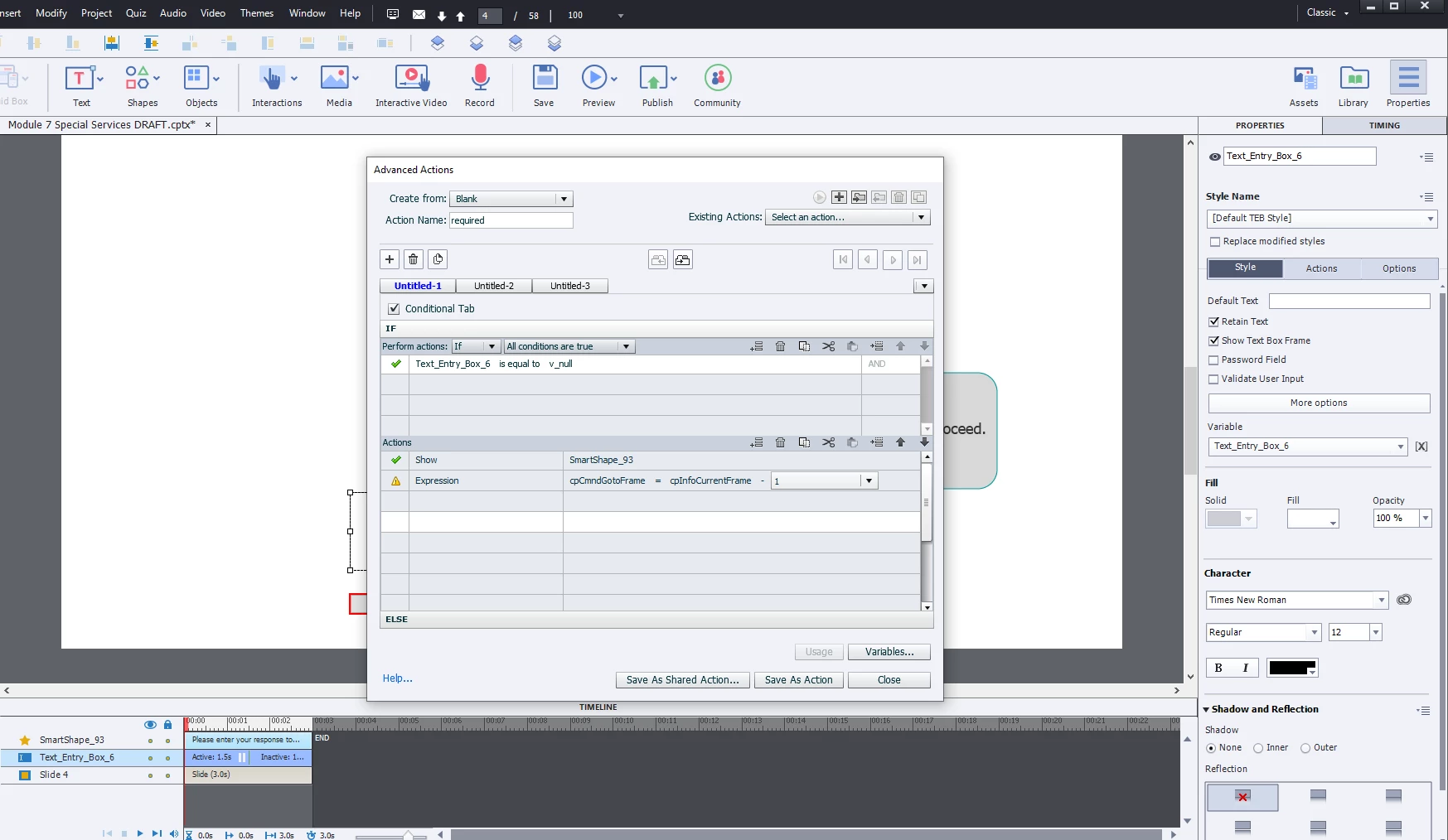 Hi I have a text entry box on slide 3, I am using the adobe captivate guide to add advanced actions to force the user to enter a response into the box. However, it is saying my script is incomplete. Anyone see my error? Is it the "1"?