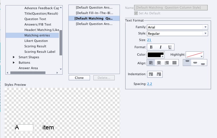 Coincidence, but I double-checked this morning a similar problem for another user, linked with the Quick Start project Aspire. The developers forgot to edit the quizzing master slides. Matching question had white font on white background. It can be easily fixed by editing the default styles. If you do this before inserting the quiz slides, everything is updated correctly. If you do it after the quiz slides are inserted, you may need to check the master slides, and eventually use the button 'Reset Master slide' for the already inserted quiz slides.