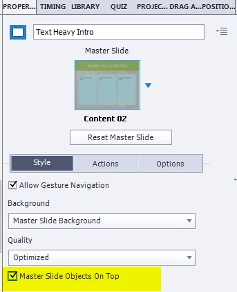 I need to set Master Slide Objects on Top. But there is no such properties in the master slide view in Captivate 9.