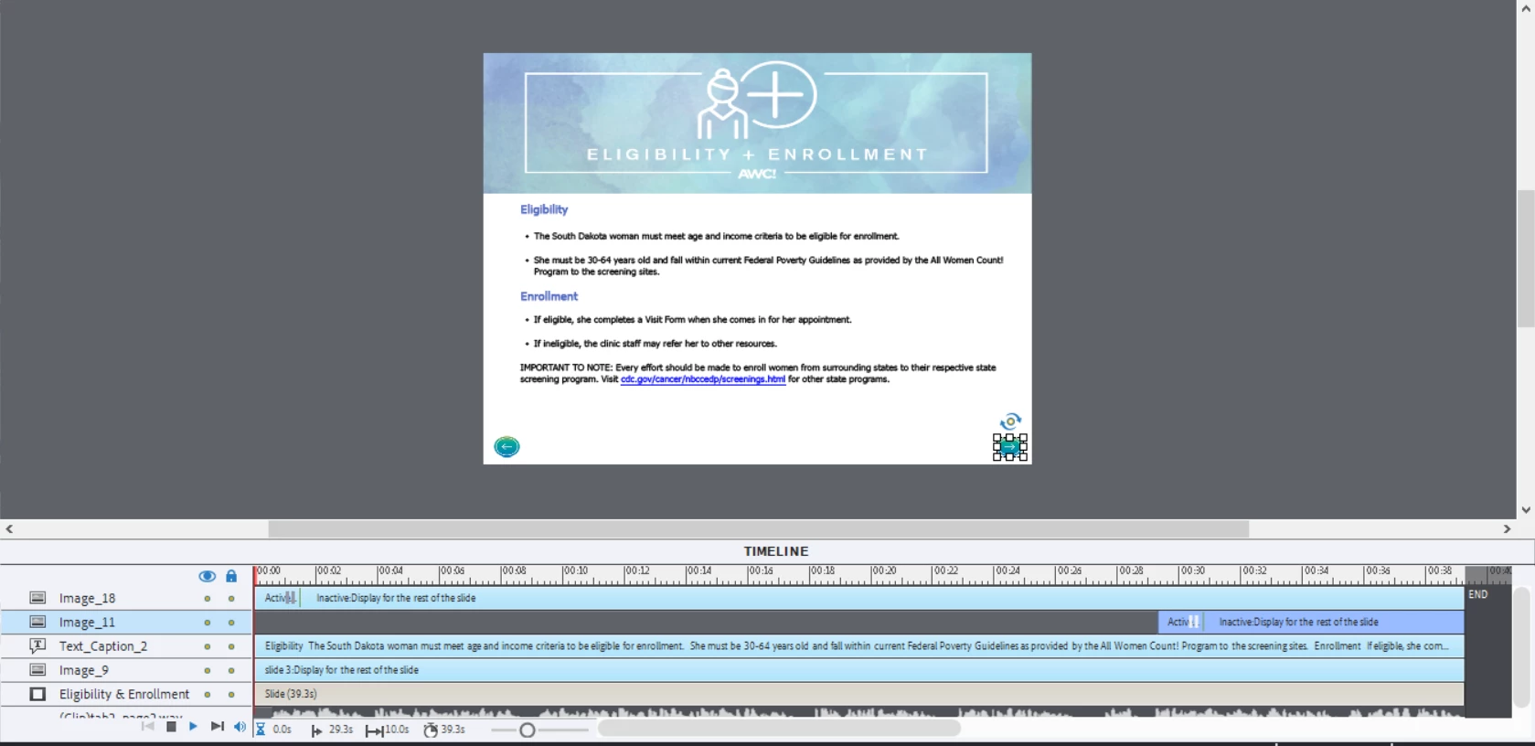 I created a course from scratch with recorded audio. I don’t want the "Next" slide button to appear until close to the end of the audio. I tried setting timing for that button to ‘Appear After’ and set the time close to the length of the audio playback. I have it selected to display for Rest of Slide.