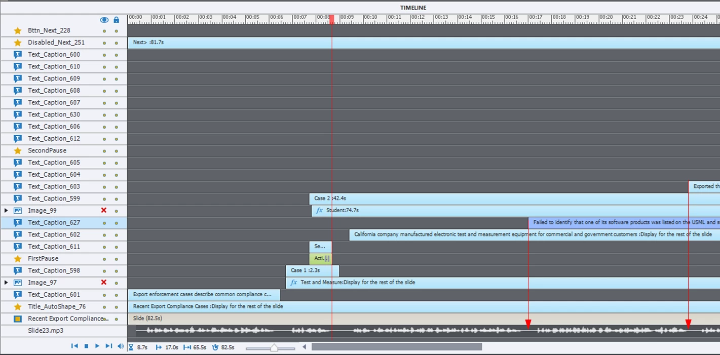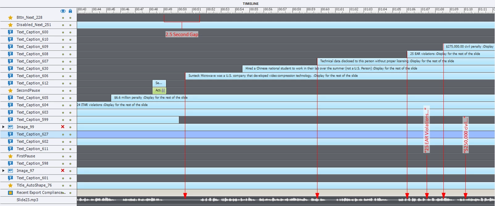 I had to add a 2.5 second gap to prevent the audio from continuing at the second pause and then after that, I had to shift objects to the left to ensure they appear at the right time in sync with the audio. I had to make these adjustments after publishing because it is even worse on the LMS, so I'm basically guessing where to drag the start of each object.