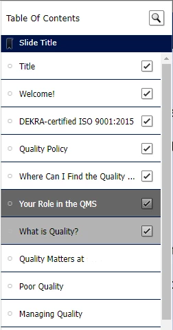 I have a course on an LMS that uses a TOC set to Navigate Visited Slides Only. This works as advertised as long as you are in the current session. We just discovered that if you exit the LMS and return, the TOC correctly indicates the visited slides but they are not selectable. My TOC settings are shown below, along side the TOC. In the TOC example below, the first five slides were viewed in the previous session. The Rollover state does not show nor are those slides selectable. I don't think there is anything I can change in the TOC Settings. I'm using the default LMS Advanced Settings. Hoping for a solution from the community as I have several courses set up the same way.