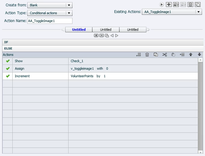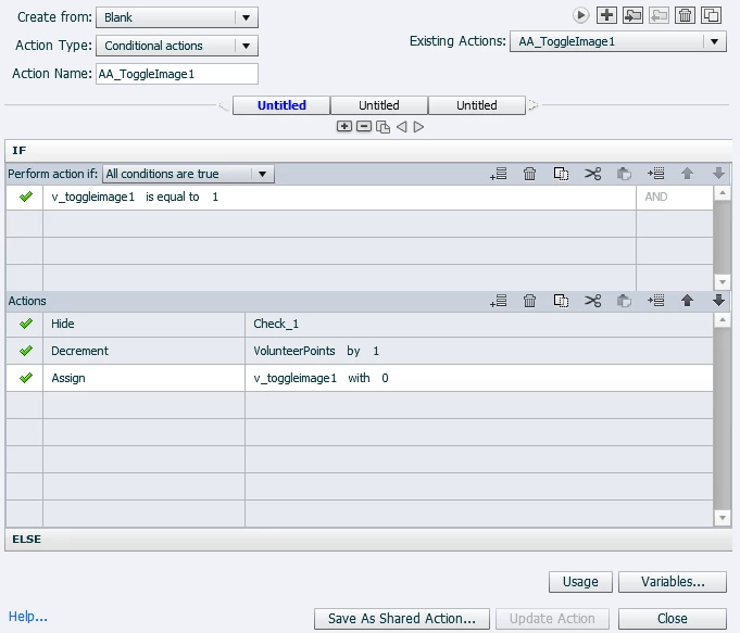 I’ve got 14 buttons for a 14-question self-assessment. The Self-assessment is self-scoring, so 9 out of the 14 questions have a scoring value (1) added, the other 5 do not have a scoring value (wrong answer). Each question has its own variable and advanced action. I tried to follow a way to do this via an eBook that I think was written for Cap7, so I didn't use the actual "toggle" action. Can someone help me update my advanced action for Cap 9?