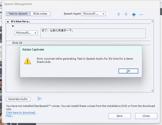 Trouble generating Chinese Text-to-Speech audio in Adobe Captivate 2019.