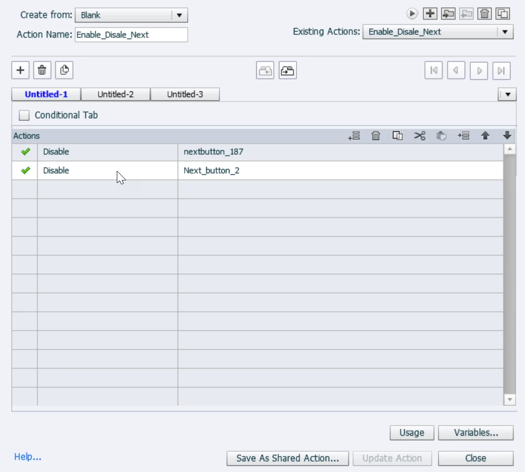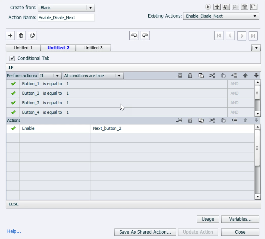On the same script, I have created the condition that all of the pink buttons needs to be clicked to enable the Next_button_2, shown in the below screenshot.