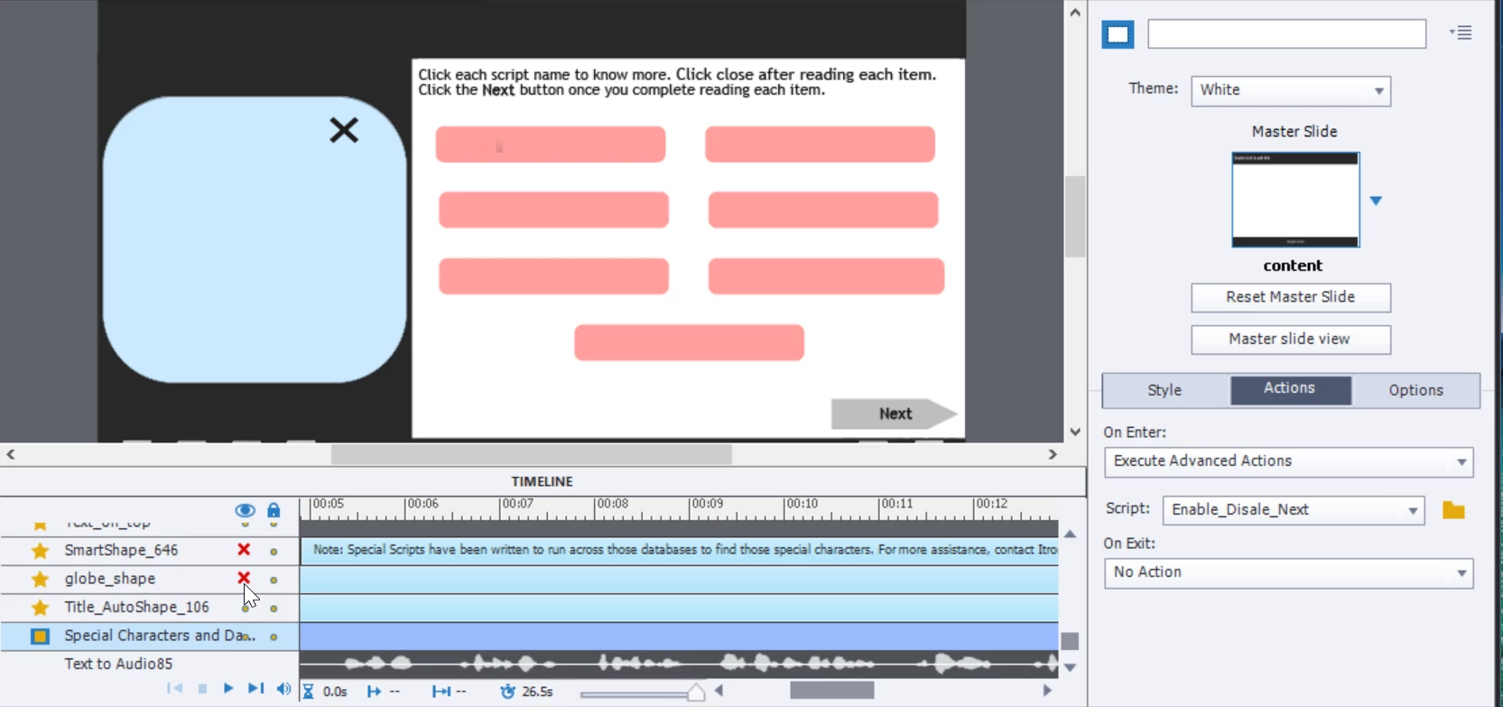 So, I tried to create a slide where the Navigation for next(nextbutton_187) would be disabled upon entering, and I created a Next button (Next_button_2) on the slide, which would be enabled at the end of the slide.