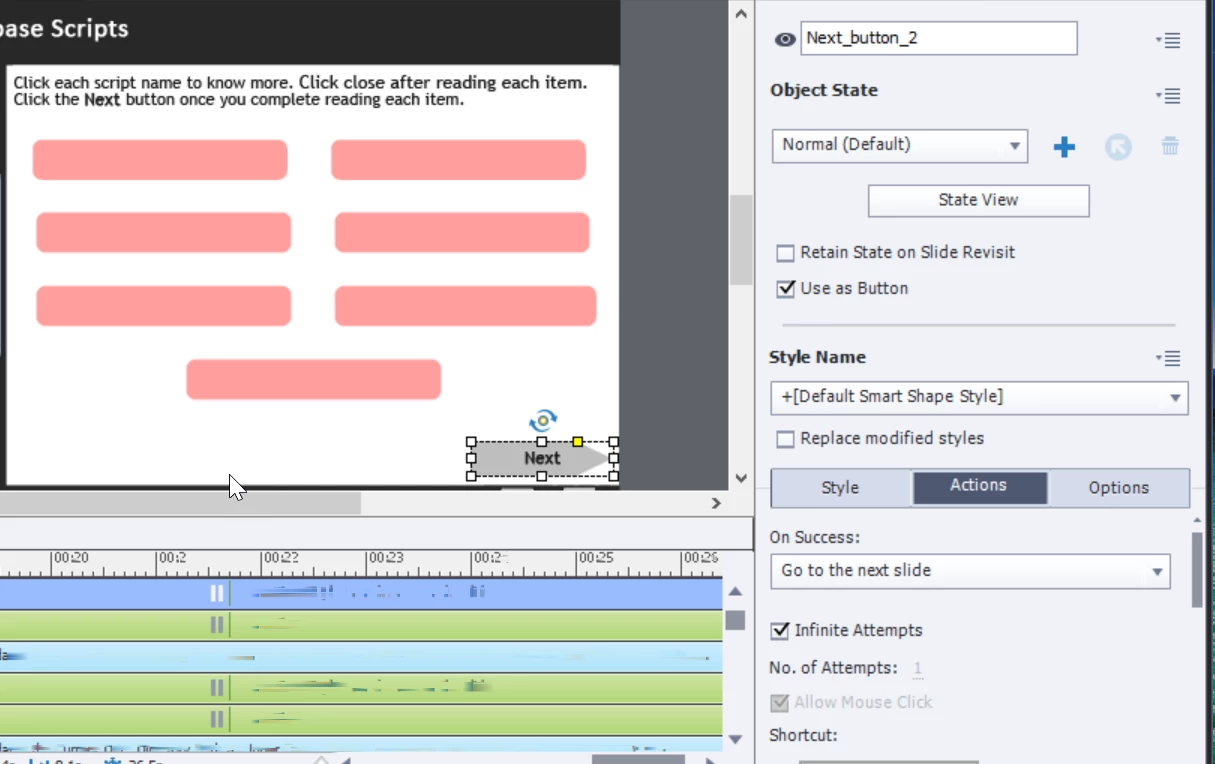 In the below screenshot you can see that the Next_button_2 has been given the action of Going to the next slide.