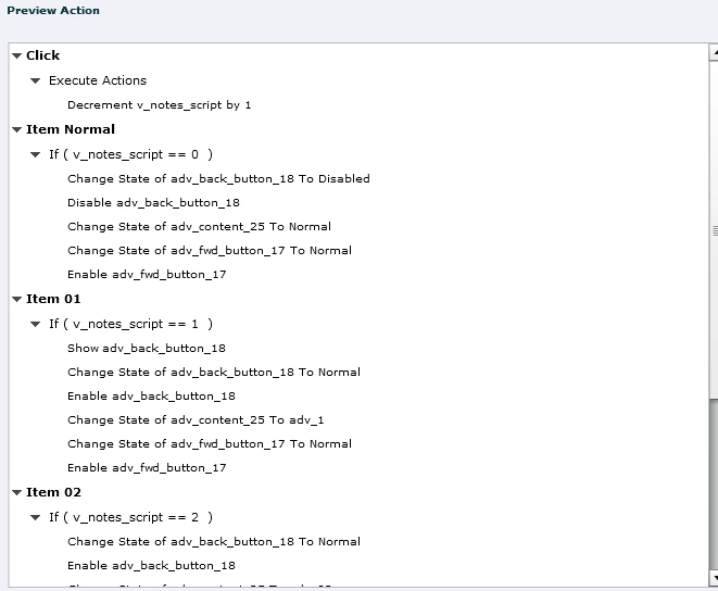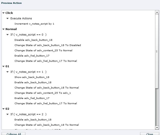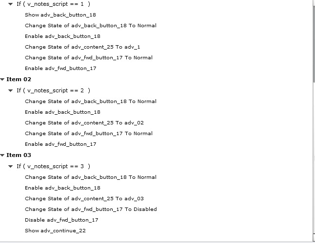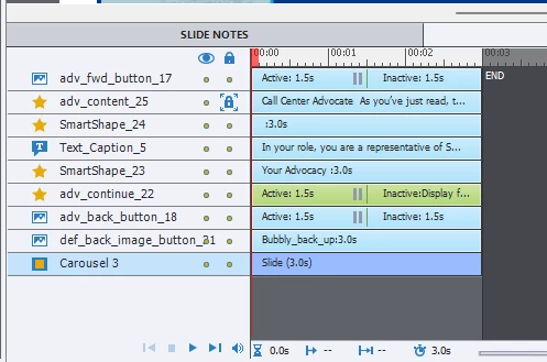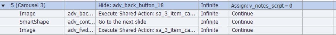 1. Slide A is a 3 item content carousel (content is placed on a smart shape with the following states: Normal, Notes01, Notes02, and Notes03). I have shared actions for forward and backward buttons. The smart shape button to go to next slide (which I have labeled as Continue) remains hidden until all the content in the carousel has been viewed. Users can go back and forward as much as they wish in the content before leaving the slide by hitting the "Continue" button (which I have set as "on succes" to take viewers to next slide). It works as intended on the initial visit.