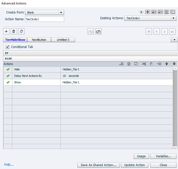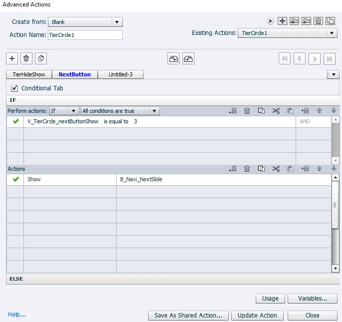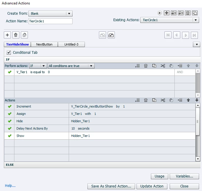2) I have a varible for each of the 3 buttons on the screen. The first time you click it, it increments the next_button_varible. (I have a conditional action here, so that only the first time you click on the button it increments the next_varible.)
