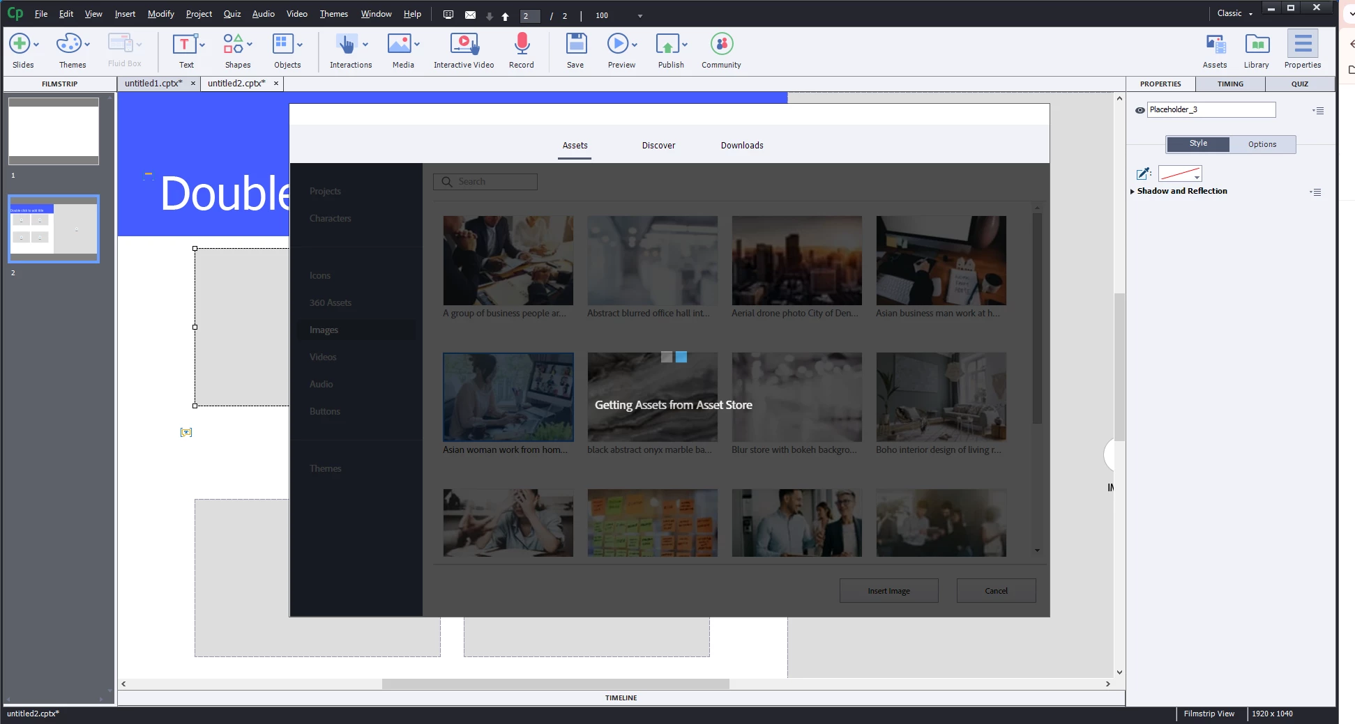 I've just recently started using Captivate, and any time I attempt to download any type of asset the screen stops at "Getting Assets from the Asset Store". The "loading" icon keeps moving, but nothing happens no matter how long the screen is kept open.