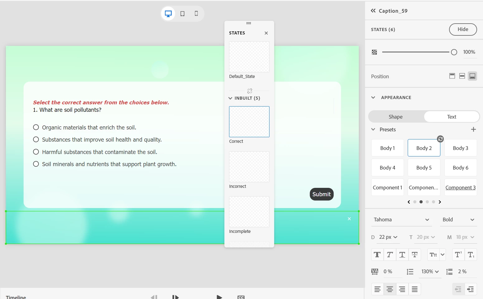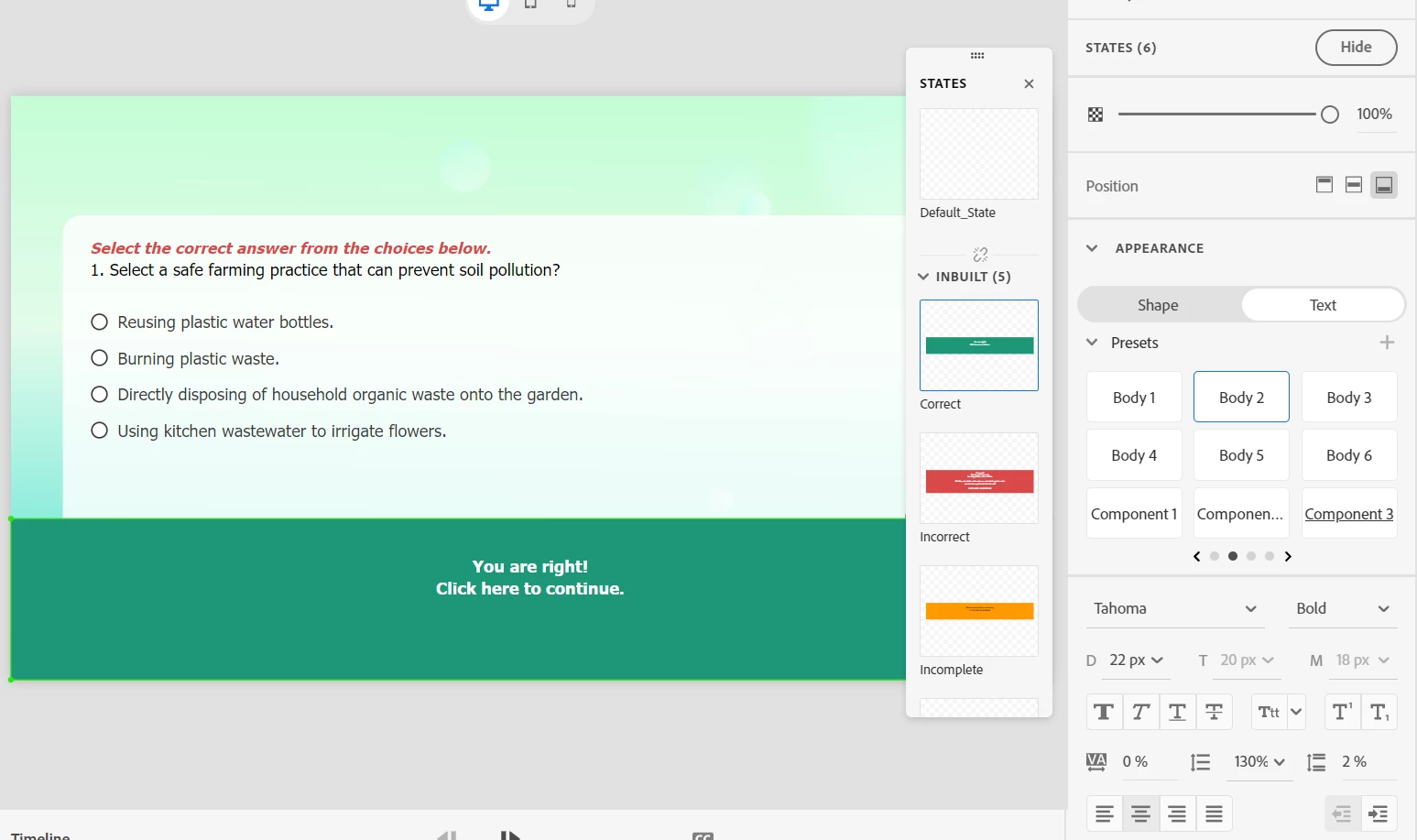 I'm creating a test for my client, but when you click next button every time appears message for correct or incorrect answer. I think that I can hide these messages thru Components-> Caption, but the chechbox is unable to uncheck.