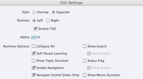 The other layer to this is the TOC. My TOC is set up so that students can only navigate to visited slides (screenshot of settings attached). The Question slides are included in the TOC. What I'm finding is that when I progress through the quiz and get all the questions correct – therefore, never visiting the Incorrect Answer slides – the Question slides are not marked as visited and I can't navigate to them via the TOC.