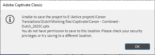 I am running into the frustrating situation where a project which saves just fine all of a sudden gives me the error that I do not have permission to save the project any more: