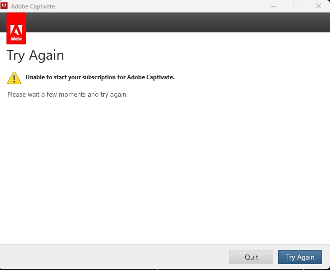 I have a valid license for Captivate 2019, but all of a sudden since the last few hours, attempting to launch the application displays this message "Unable to start your subscription for Adobe Captivate".... the application then freezes and crashes eventually.