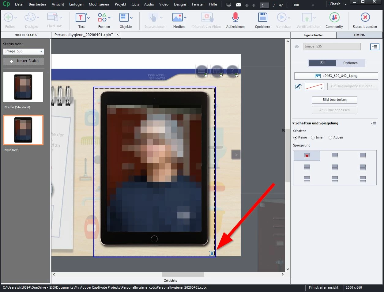I know it can work! See here in thos example, there i have no lock and i can resize the image that popups bei klicken on a shape below. There is no lock! But i dont understand what i do wrong. I activate the "'Use as button" und create a new cutom state.