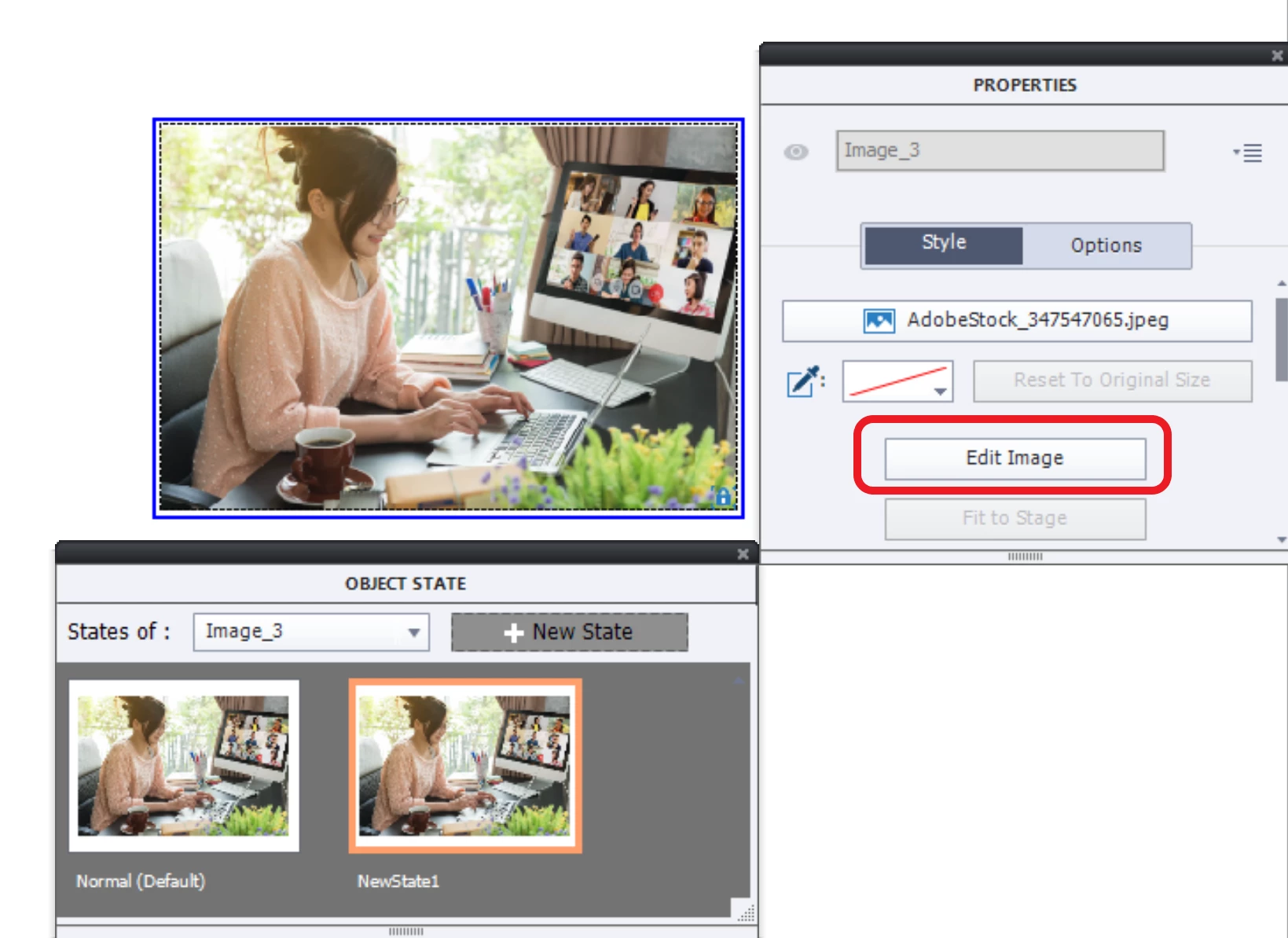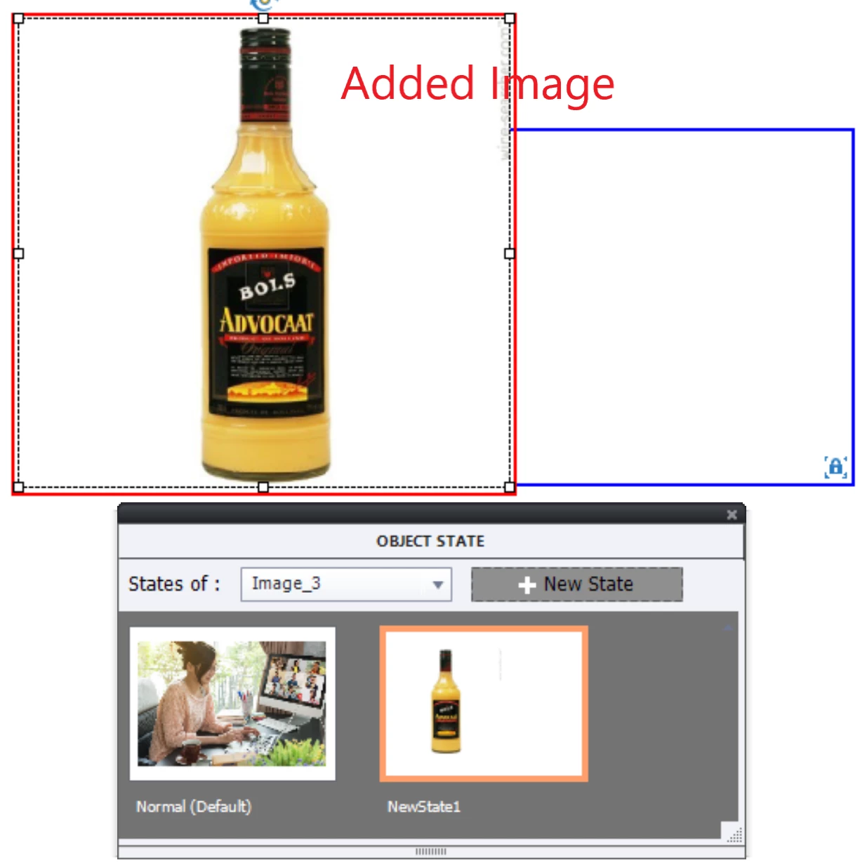 That example can even be a button. Itt has a Normal state which is empty (will probably be a shape with Alpha and stroke set to 0). What you show in the screenshot for the custom state has a RED border. The locked state in your first screenshot has a BLUE border, which is indicating the locked size of the original Normal state. Just add another image either with the Media button or by dragging from the Library: it will have a RED border and is completely unlocked.
