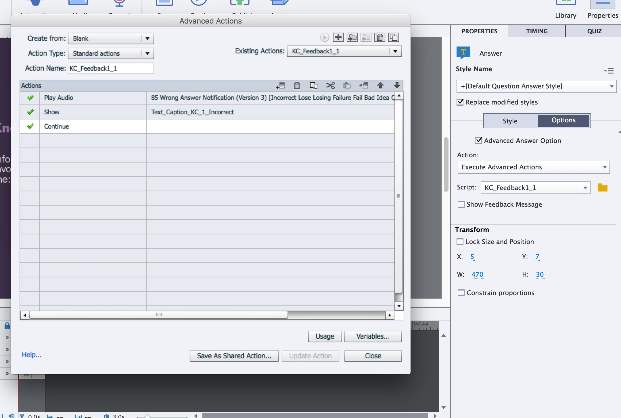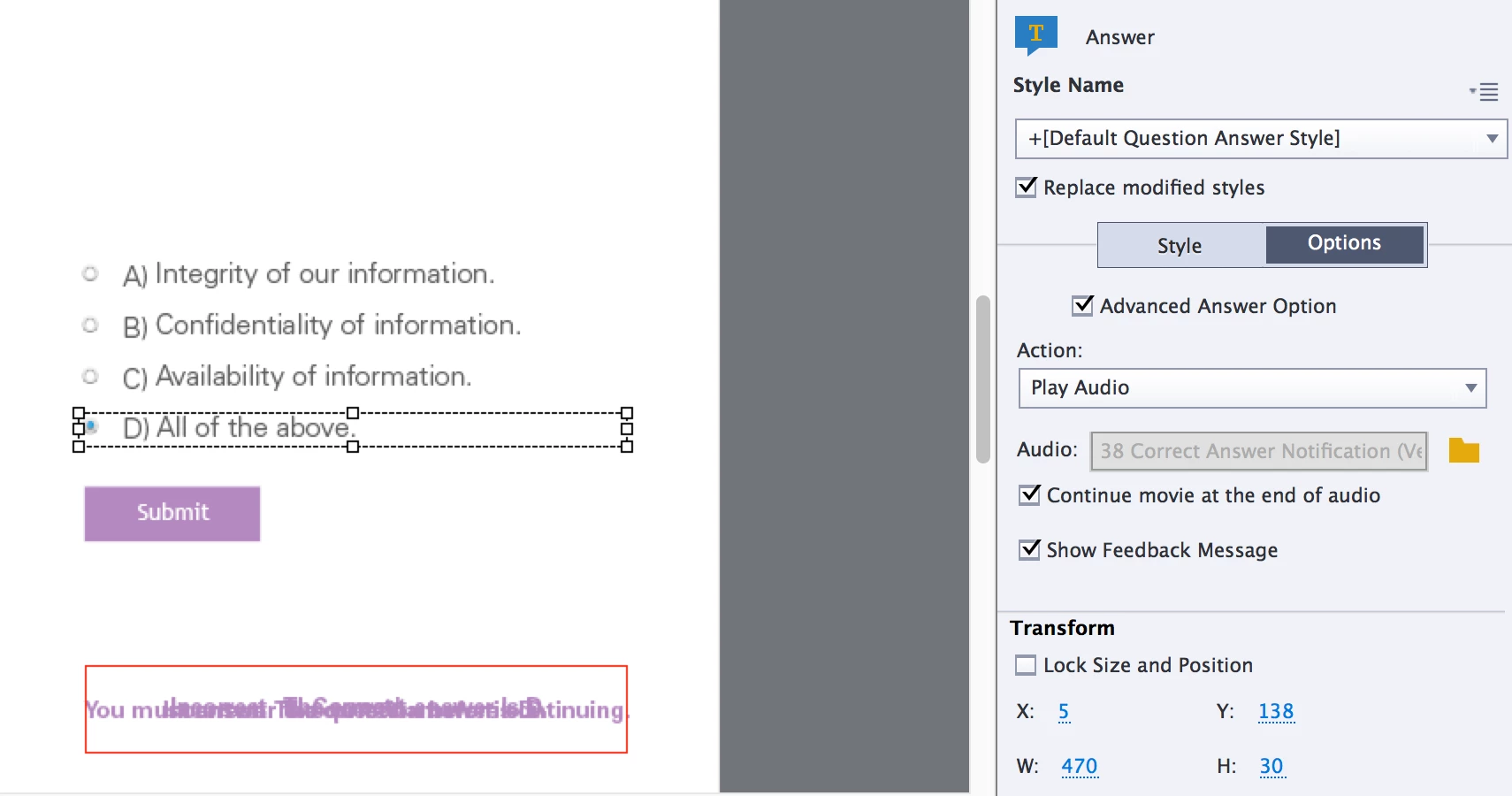 When I try and get it to work, the text feedback displays as soon as I answer the question and then not until I click the screen does the audio play. When the audio finishes, it automatically advanced to the next slide. Its weird, like you cant have both at the same time, even though it allow you to choose both.