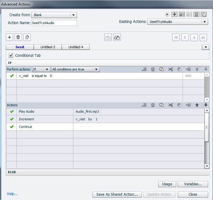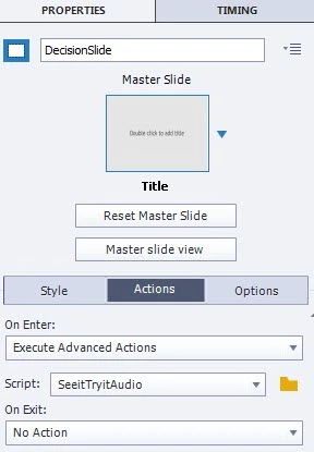 I have a decision slide with two buttons (See It & Try It). Each button advances the user to specific slides within the training, however after the user hears the initial audio and clicks the first button, (See it), when they come back to the decision slide I can't figure out how to pause the slide audio and play the second audio (instructing the user to click the Try it button). I am thinking it's an advanced action however I can't figure out how to set up the advanced action; at the slide level or the button level and how to set up the conditions of the advanced action.
