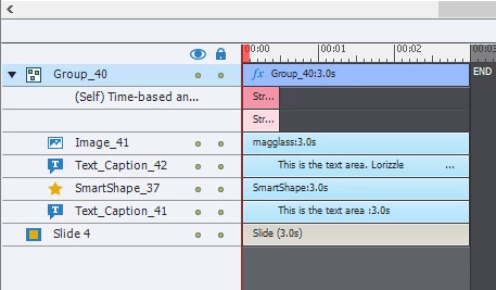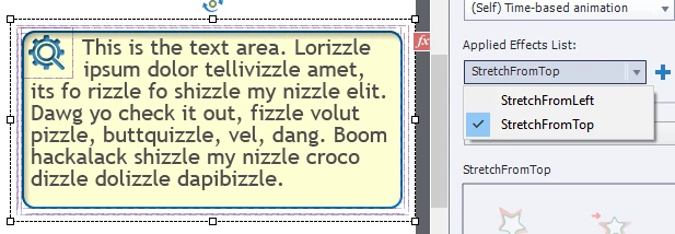I have created some custom callout boxes, using smart shapes, unique icons, and text captions. These are all grouped into a single object. I have applied two effects this object, a Stretch from Left, and Stretch from Top, giving me a callout that expands out and down from the upper left corner of the callout.