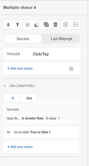 This doesn't seem to work. Is it me or Captivate? I do have another interaction on the page that runs on a bookmark - if bookmark is reached, advance to next slide. ( which is above my quiz attempt variable). Do interactions have to appear in a certain order? I don't seem to be able to re-arrange them.