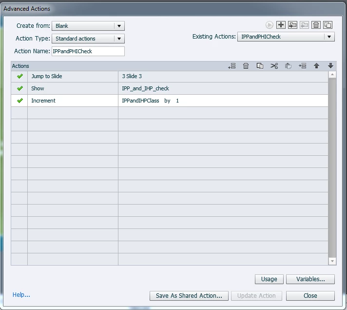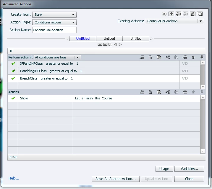 The condition I made in the advance action is that is all three variables are equal or greater to one, then a button will show.