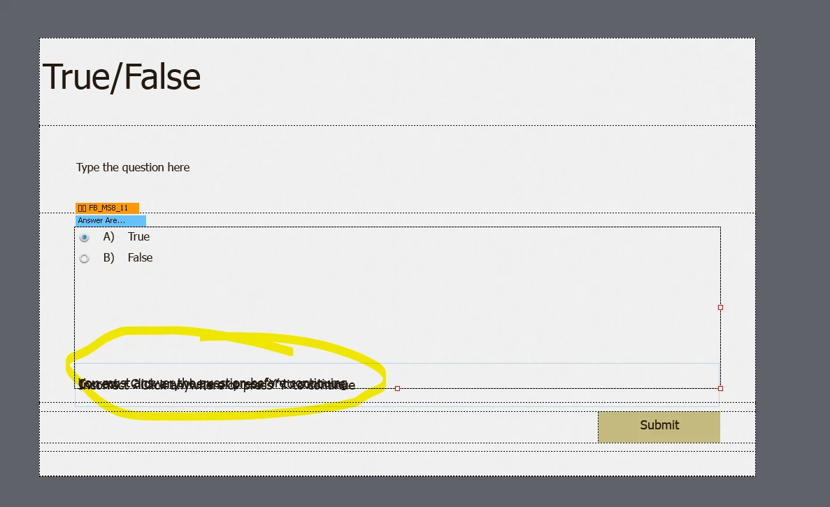 Does anyone else have this problem. When I choose to insert a question slide and use a True/False slide. I get this? I cannot simply make a true/false slide and its a nightmare to sort out the text