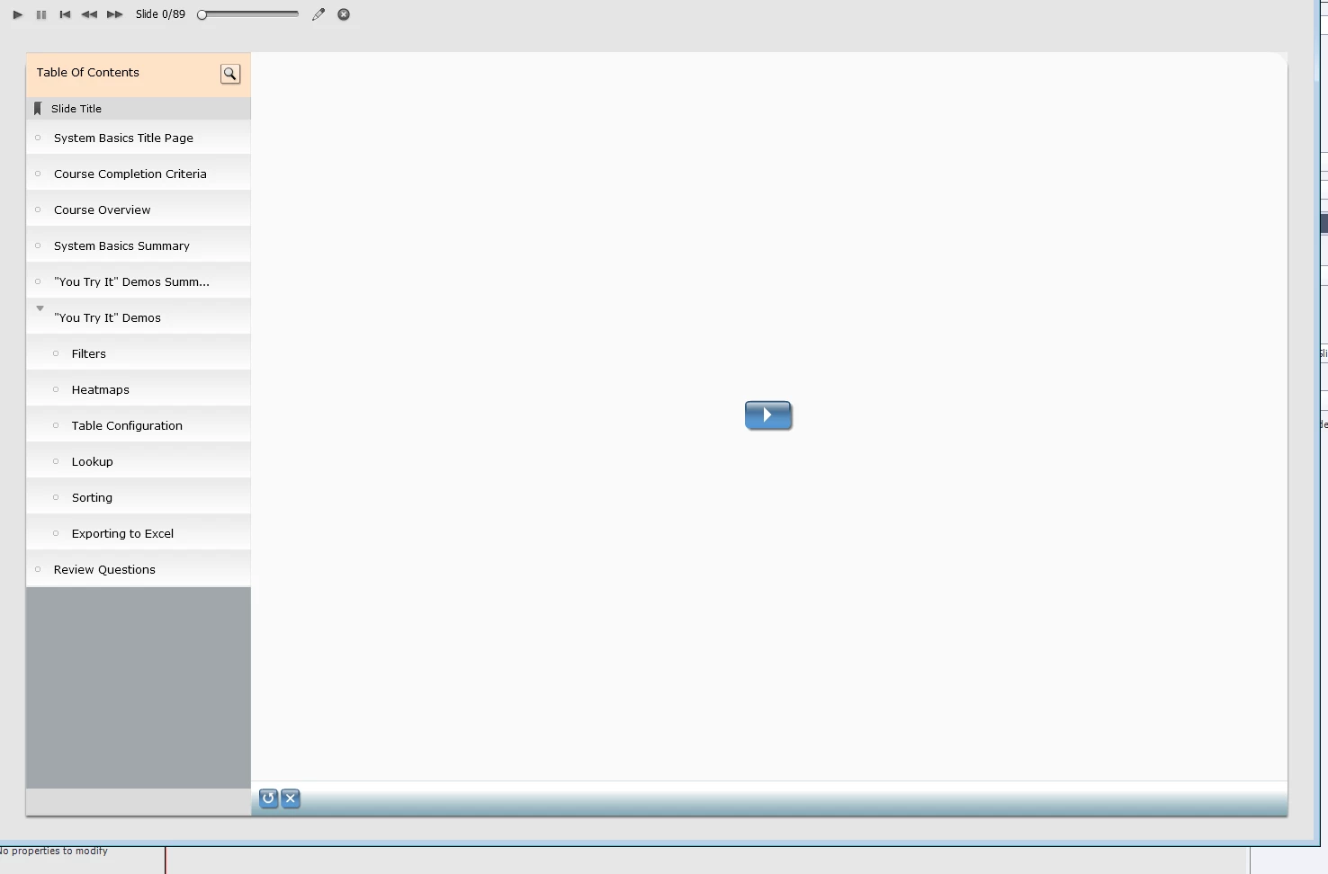 The Captivate TOC suggests that the first slide should be "System Basics Title Page". But instead I get the screen below. You have to click the arrow to start the course. Not terrible, but I'd prefer to just have it start with my first slide. Ideas?
