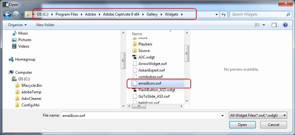 A quick look on the Adobe Captivate Assets Library online to download available free assets didn't seem to show anyplace where I could download the email icon widget and save it into the appropriate Adobe Captivate Widget folder.