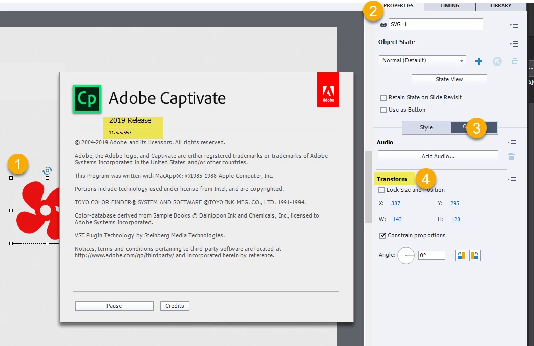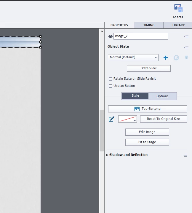 The positiong and placement of a non-interactive object is supposed to be in the Transform section of Properties. https://helpx.adobe.com/captivate/using/library-objects.html