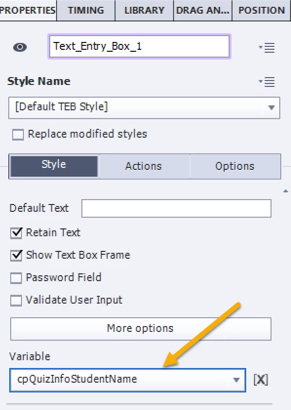 Which field do I use to populate the students name in the certification of completion. I have my project set up so that the student types his or her name in the text entry box on the first screen. I want whatever is type in the text entry field to appear on the certificate of completion after the knowledge check, however I don't know what variable to use. Can someone assist? Thanks!!