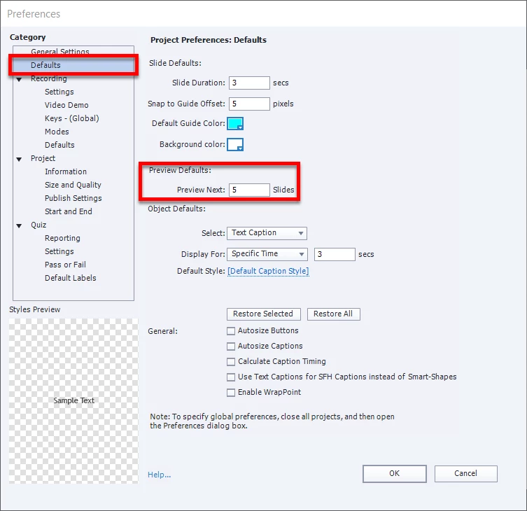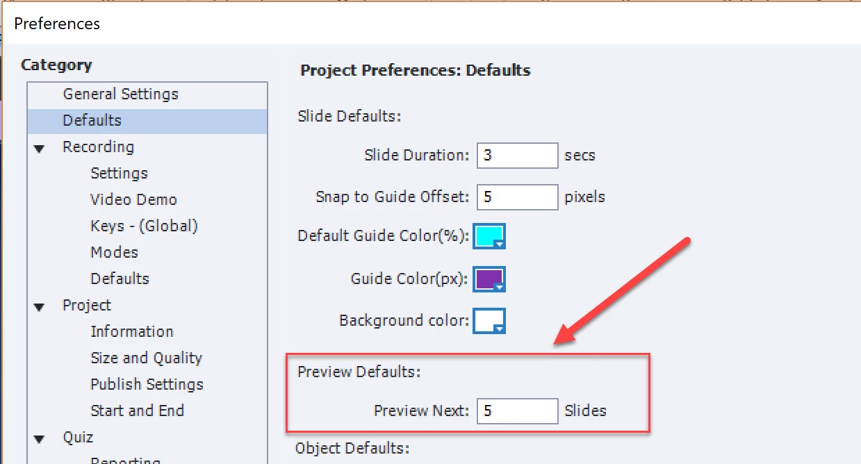 I am reviewing Captivate files created by the same person and one of them allows me to preview "Next 5 slides" and the other course only allows me to preview "Next 1 slides." Why is it different and how can I get it to allow me to preview 5 at a time when needed?