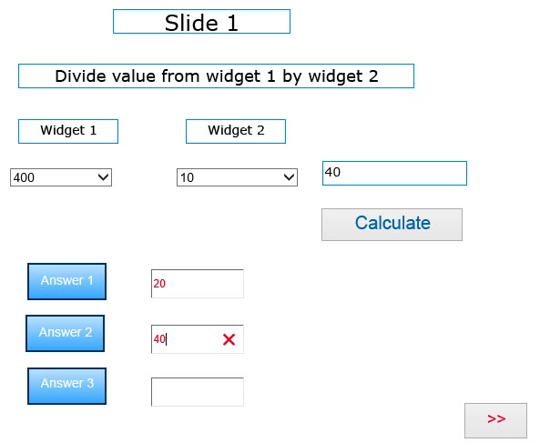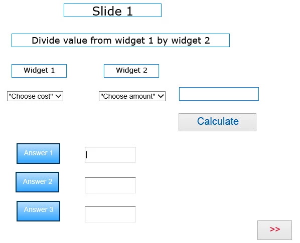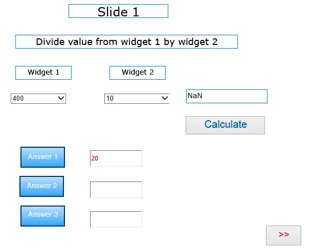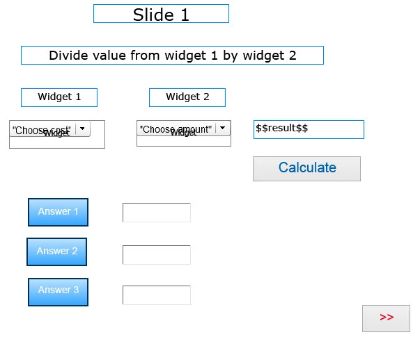 The first slide contains two widget with drop down values and a button which is used to divide the value of the first widget by the value in the second widget e.g. 200/10. The calculate button is linked to advanced actions.